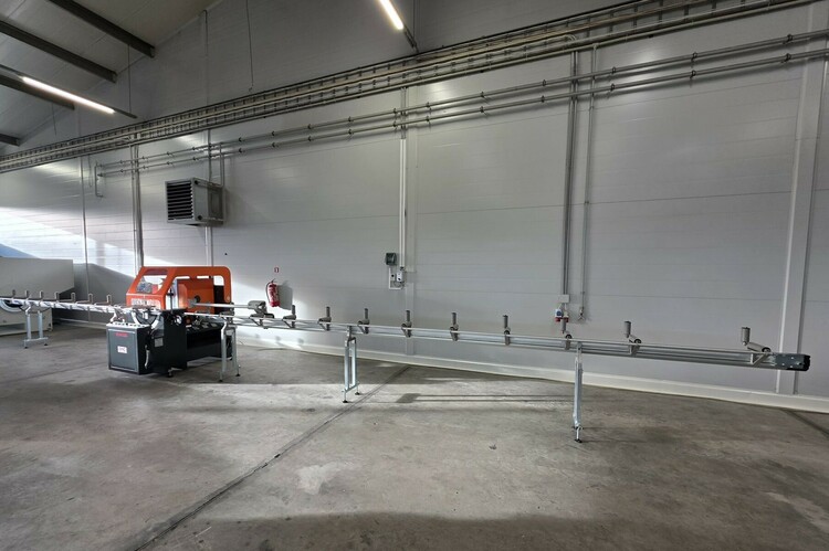 Single-head cutting machine with blades Ø 600 with neasuring roller conveyor 6m and inlet covveyor 4